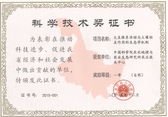 (1)大豆根系活動(dòng)與土壤相互作用的生態(tài)學(xué)機(jī)制,2015年獲得黑龍江省自然科學(xué)一等獎(jiǎng)。該成果闡明了大豆根系活動(dòng)與土壤相互作用的生態(tài)學(xué)機(jī)制,旨在為調(diào)整黑龍江作物種植結(jié)構(gòu),增加玉米-大豆輪作面積和節(jié)肥節(jié)藥提供理論依據(jù)。